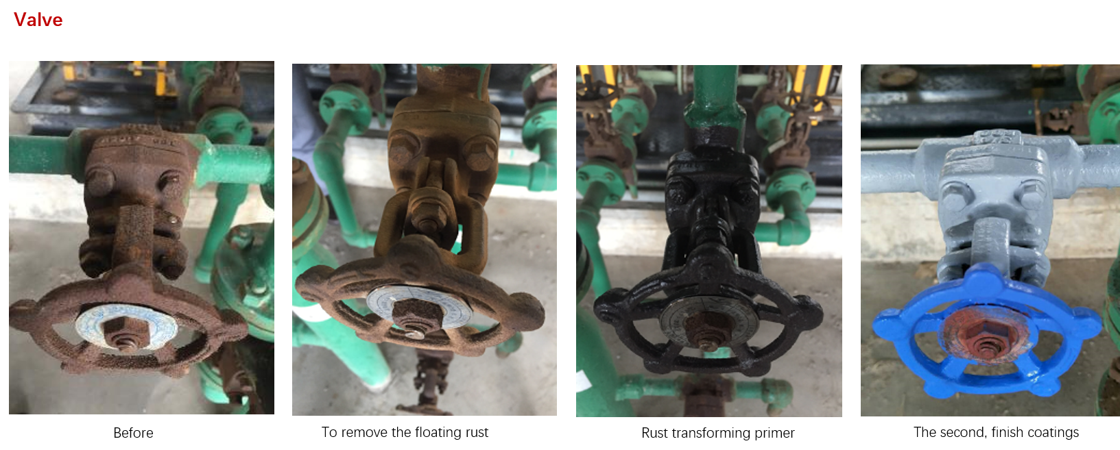 - Rust transforming coating which can avoid mechanical polishing or sanding, thus result in the better safety, especially in petrochemical industry;