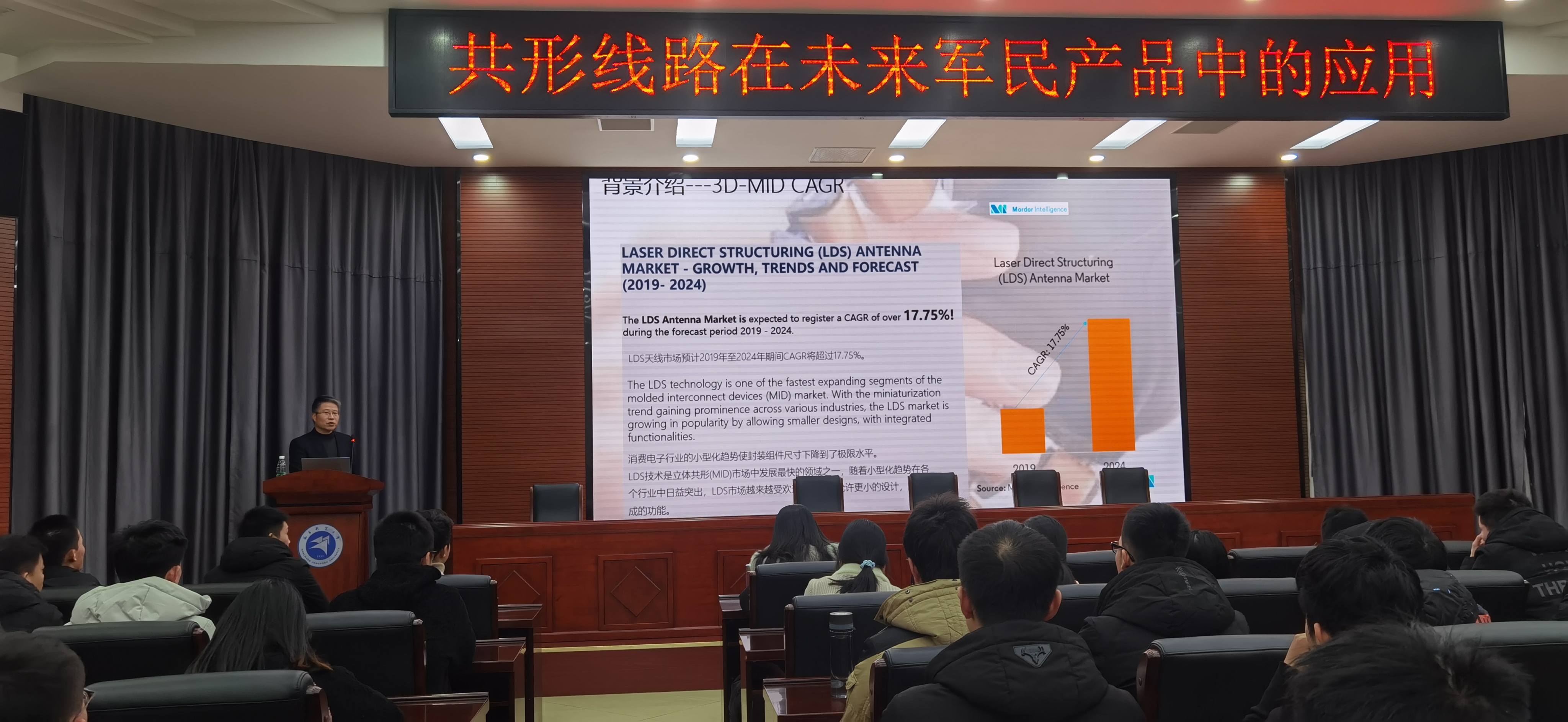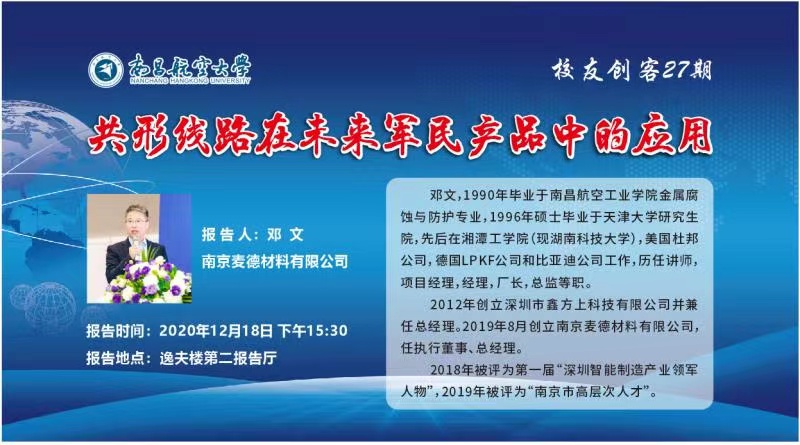 2020年12月18日 下午15:30,鄧文總經(jīng)理參加南昌航空大學校友創(chuàng)客講座,在逸夫樓第二報告廳為全校師生做報告《共形線路在未來軍民產(chǎn)品中的應用》,鄧總結(jié)合自己的親身工作經(jīng)歷,為師生們深入淺出地講解了立體線路的特點及在工業(yè)制造,5G技術、智能汽車、軍事領域的應用,希望同學們在學習中擴展知識面,勤學多思,在最好的時代綻放最美的自己。
